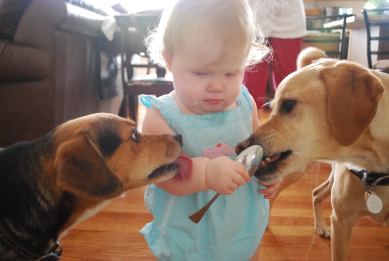 | Our first taste of pastry cream! Don’t worry Mom, I took the spoon away before she put it back in her mouth. 🙂 |