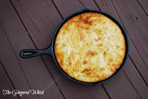 - Prepare your skillet but greasing it with butter. If it has been preheating in the oven, be careful so you don’t burn yourself! Pour the batter into a greased 9” cast iron skillet (or muffin pans, or bread pans) and then bake for 35 minutes (or 15-18 minutes for muffins).