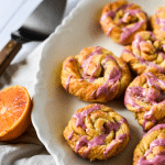 These easy orange puff pastry pinwheels are an easy dessert recipe for when you want something delicious without a lot of fuss. Spiced with orange zest, cinnamon and a little cayenne pepper, these pinwheels are drizzled with a beautifully pink blood orange glaze.