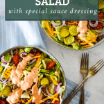 Cheeseburger Salad is just as delicious as a Big Mac but lighter and healthier! A great quick summer meal the whole family will love! Tons of crunchy romaine topped with all your favorite burger toppings, plus a special sauce dressing!