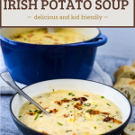 For children, Irish potato soup can be served in a small bowl. Allow the children to top their soup with the toppings they choose – shredded cheese, bacon pieces, chopped chives, and pepper. Sour cream would be a great addition, too!